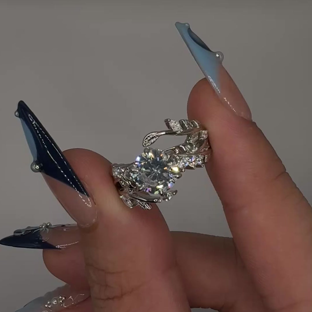 A true work of art, this ring embodies the quiet luxury of nature’s design. Flowing silver vines twist and curve gorgeously around a radiant round center stone, creating a sculptural harmony of light and form. Each leaf-shaped accent sparkles with precision-cut stones, evoking the beauty of sunlight filtering through a forest canopy. This piece symbolizes refined, modern elegance which is perfect for those who appreciate jewelry that is artistically crafted.
