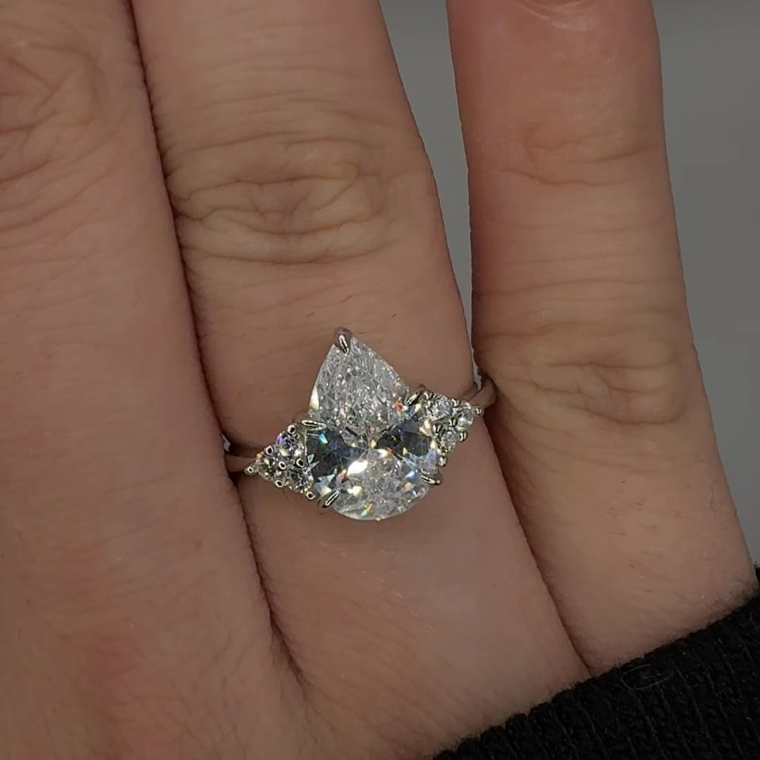 This gorgeous ring features a pear-shaped center stone that captures the serene beauty of the fading day. Clusters of smaller stones sits bilaterally, every sparkle radiates with the mystery and romance of twilight. A timeless choice desired by those who are seeking for a sense of fairy tale and magical moments that illuminate our lives.